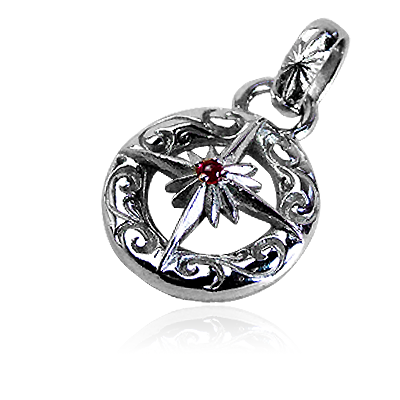 小振りな天然石の周りにサンバースト加工を施したストーンペンダントトップ。天然石に合うようにネイティブデザインのシルバーフレームを使用し、細かい部分にまで職人の技術を感じることができるアイテムに仕上げている。